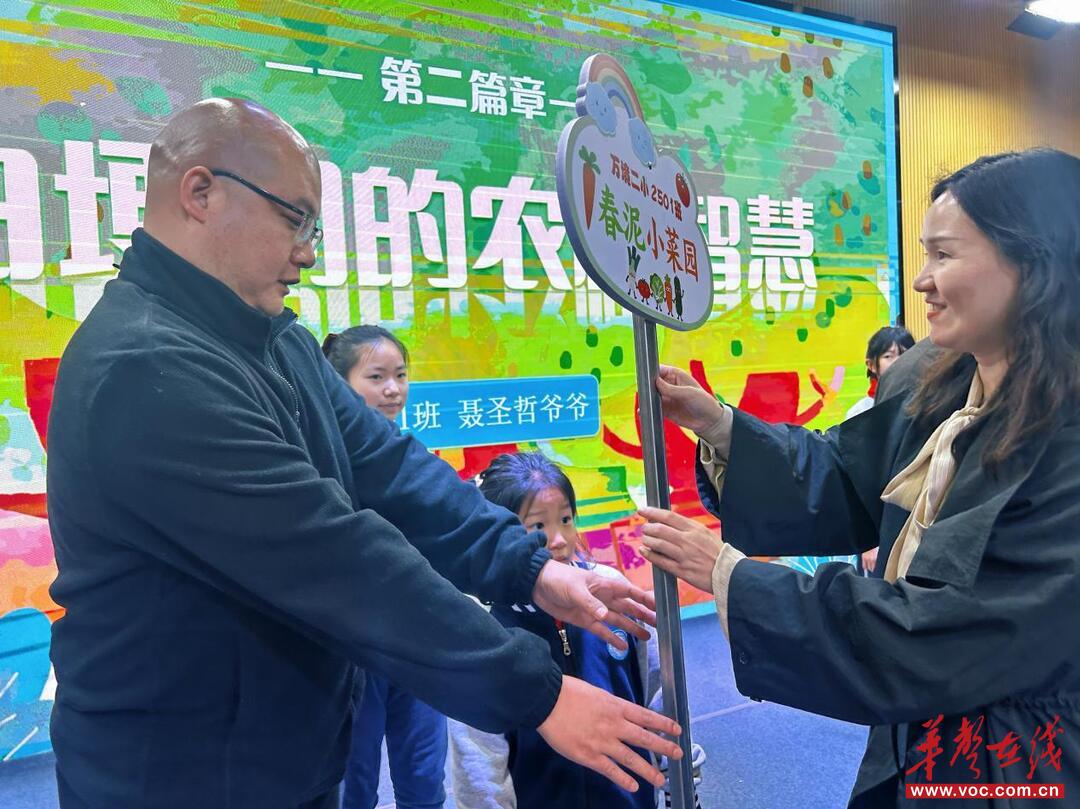 隨后,農耕指導嘉賓聶圣喆爺爺以樸實的話語,為現場親子講述田埂間的農耕智慧,從時節規律到生態種植,讓大家對農耕勞動有了更真切的理解,也讓田園實踐的期待愈發濃烈。授牌啟耕環節將儀式推向高潮,校長李艷妮為各班授予獨具班級特色的創意田園牌,一塊塊承載著勞動理念的標識,正式點亮各班農耕實踐區域,定格下家校同心的溫暖瞬間。